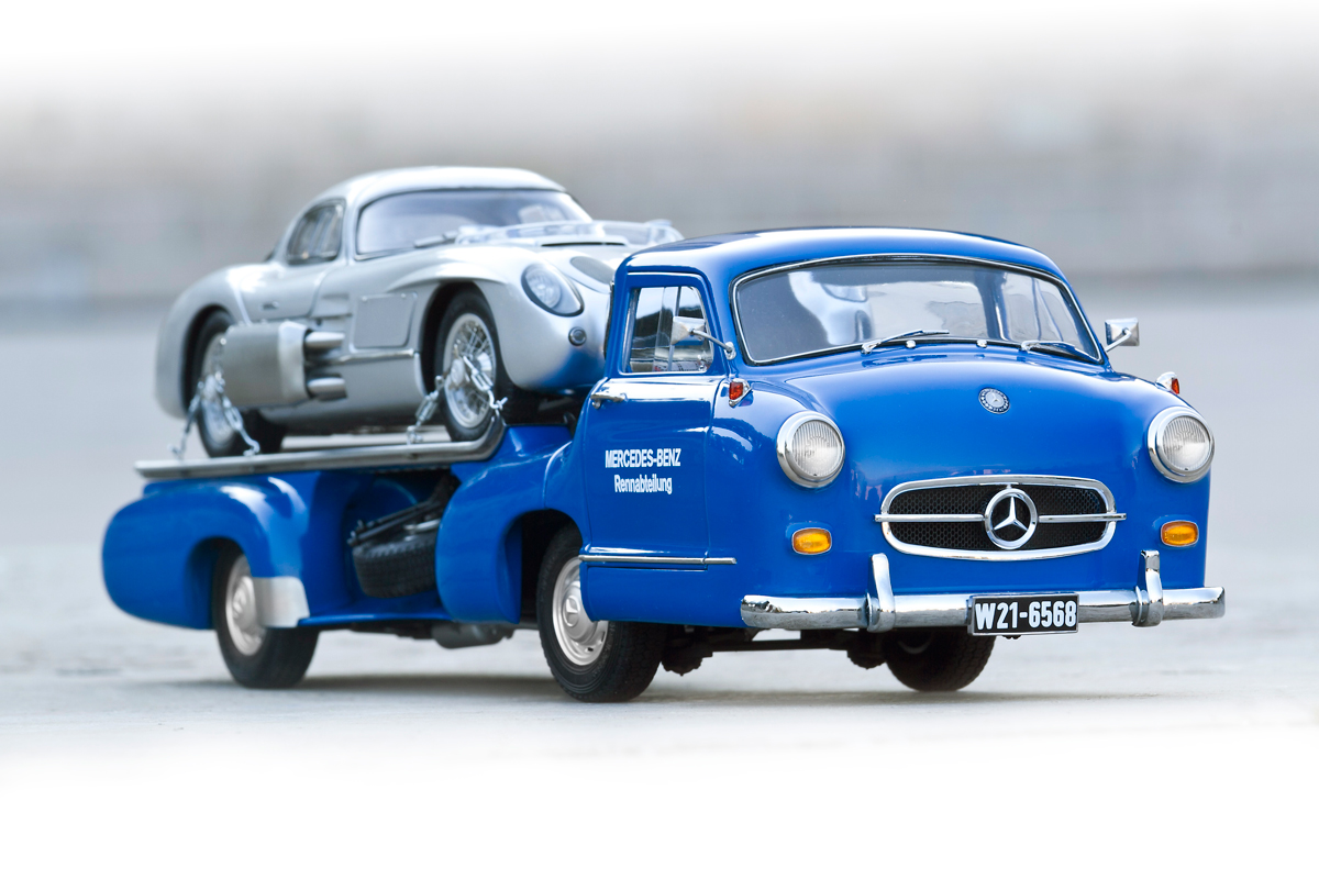 CMC Mercedes-Benz La Maravilla Azul: su nombre en alemán era «Das blaue Wunder». No importa cómo lo llames, este es un automóvil único. En septiembre de 2016, después de 14 años, CMC reeditó el icónico transportador de coches de carreras Mercedes de mediados de los 50 en escala 1:18.