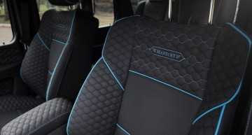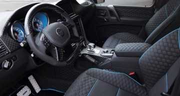 En el interior del G500 4×4², hay una inundación de carbono una vez más, con el salpicadero y el volante recibiendo tales incrustaciones. Los asientos están ahora tapizados con una mezcla de cuero acolchado y «tela de carbono». Los logotipos de Mansory son visibles aquí y allá, mientras que la costura superior y las molduras coinciden con el color exterior de la carrocería en azul claro.
