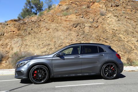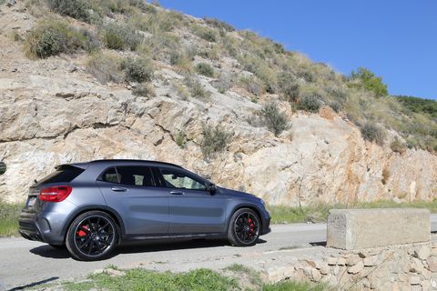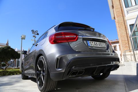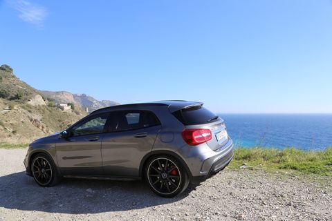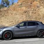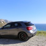 Pudimos probar el GLA 45 AMG por primera vez en marzo en España, en la zona de Málaga y Granada, donde se nos proporcionó un modelo gris montaña. Visualmente nos gusta más el GLA que el Clase A (W 176), lo que probablemente se deba al capó y a la entrada más alta. En cuanto al maletero, nos hubiera gustado tener más que suficiente espacio para 3 cajas grandes de bebidas, pero esa fue nuestra única crítica al coche. La Clase B definitivamente ofrece más espacio, pero desafortunadamente no es tan dinámica como la GLA, especialmente porque la Clase B todavía no estará disponible como una variante de la AMG.