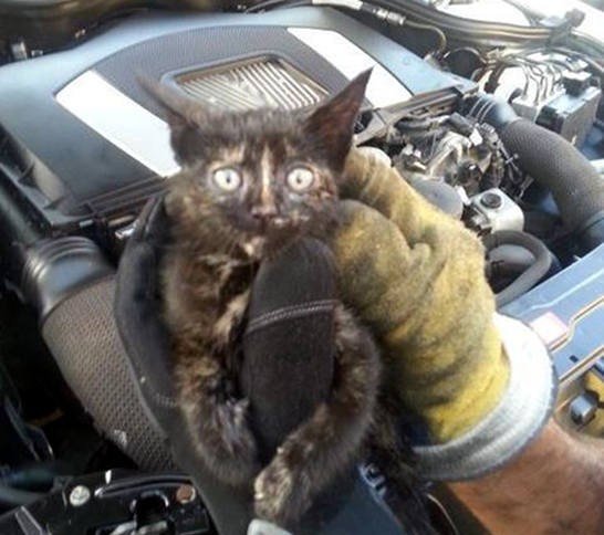 El mecánico maullador – Gato salvado del motor de un Mercedes