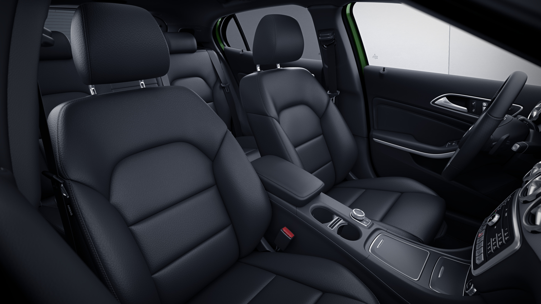 El interior del GLA con el Paquete Exclusivo de Confort obtiene un aspecto especial fuera de la carretera gracias a los distintivos asientos de confort en cuero de búfalo negro, aunque el aspecto de los asientos no se había ofrecido antes de esta manera. La calefacción del asiento para el conductor y el pasajero delantero, el paquete Seat Comfort y el soporte lumbar de 4 vías garantizan simultáneamente un alto nivel de confort individual para los ocupantes.