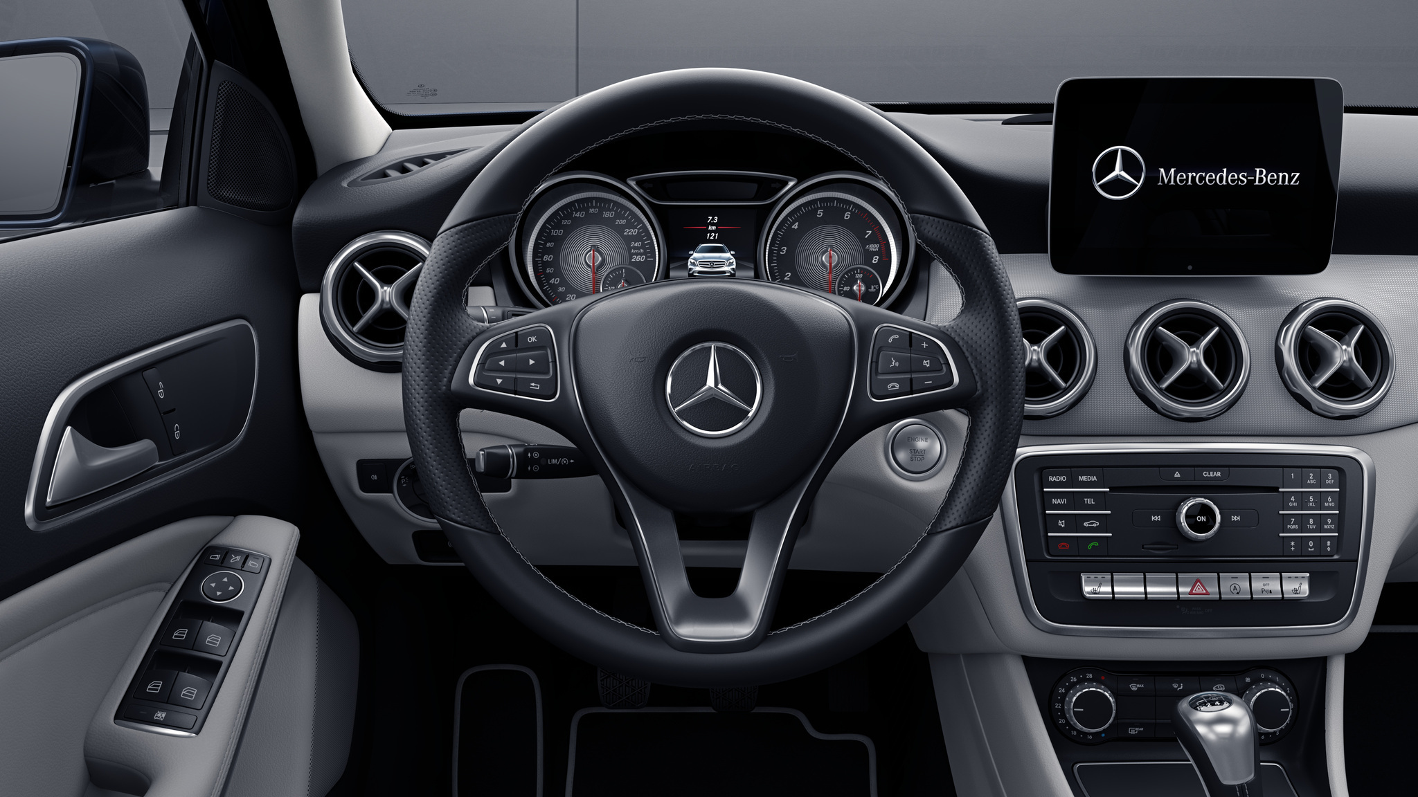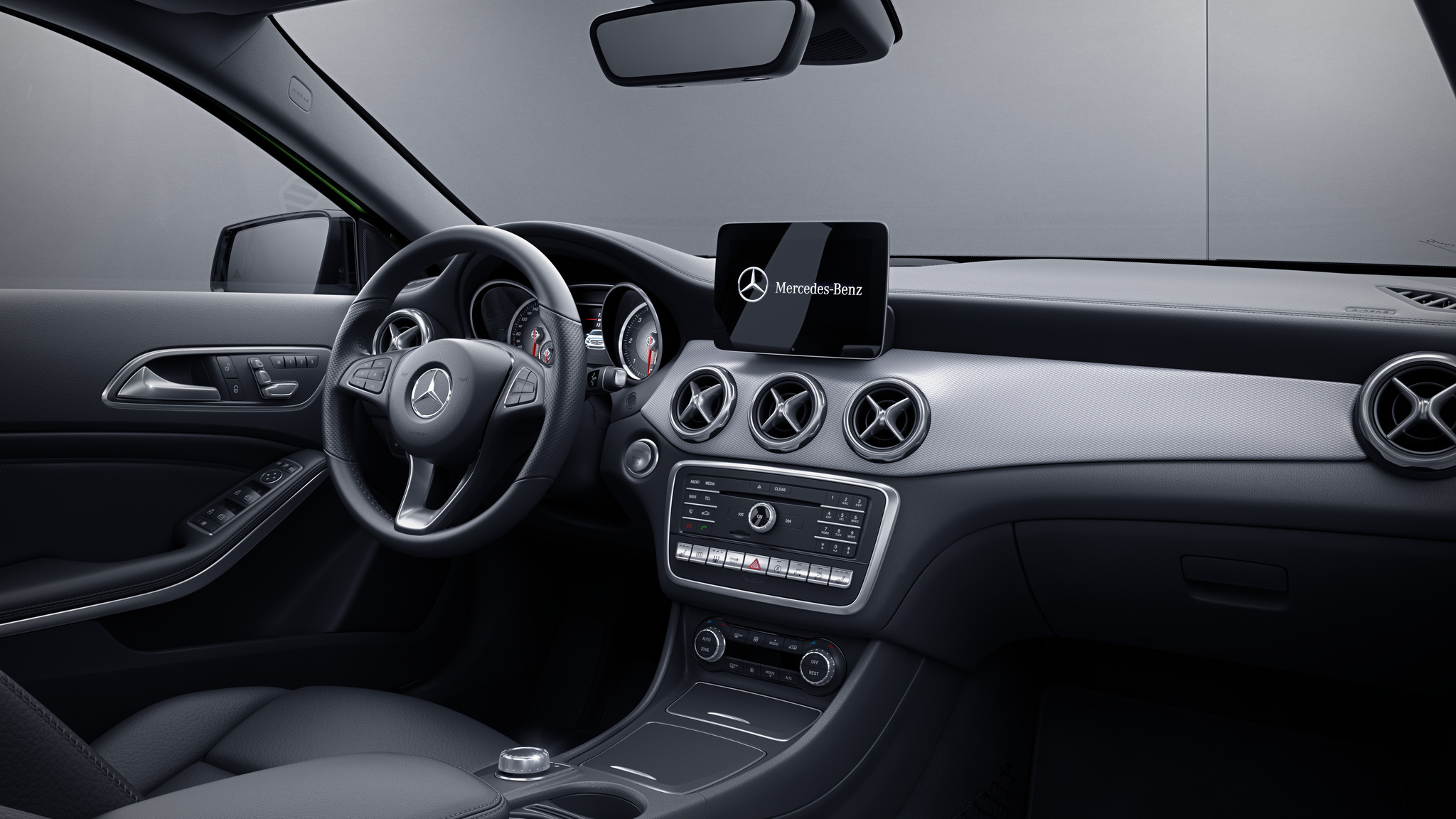 El panel de instrumentos y los paneles centrales de las puertas en cuero artificial ARTICO también mejoran el ambiente. Las costuras y elementos de diseño en contraste en aluminio y cromo plateado refuerzan la impresión exclusiva, al igual que el elemento de aluminio con corte trapezoidal. Otras características son el soporte multifuncional en la consola central, el sistema de cierre de confort con apertura/cierre en verano para las ventanas laterales o la toma de 12 V en la parte trasera del GLA.